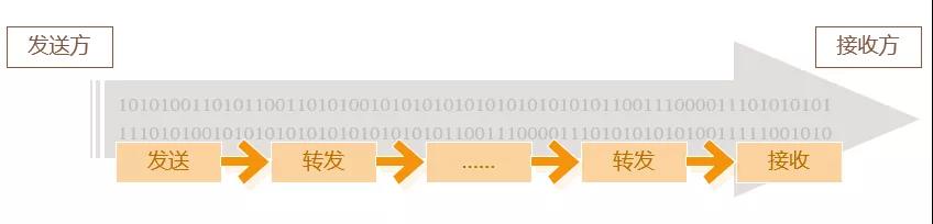 与存储、加工等环节不同,数据传输活动的“主体”涉及到发送方、接收方以及传输路径上的多个中间节点等多个实体。为便于分析安全需求,应将一次完整的数据传输会话拆分为多个数据处理行为,即一个“发送”、多个“转发”和一个“接收”(组播、广播等数据传输活动包含多个“接收”行为),如下图所示。每个数据处理行为都仅涉及单一主体,可以通过分析其主体身份、数据本身和处理行为对数据安全需求进行综合分析。