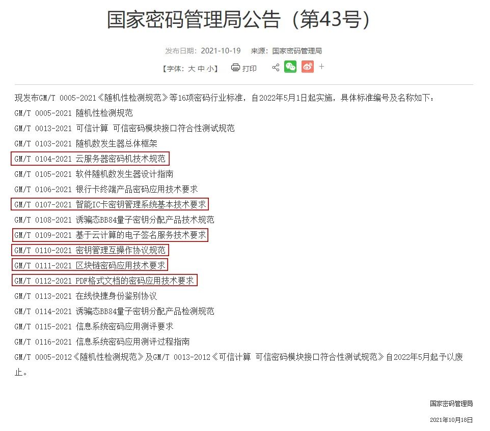10月19日,国家密码管理局发布国家密码管理局公告(第43号),GM/T 0005-2021《随机性检测规范》等16项密码行业标准获批发布,将于2022年5月1日起实施。其中,北京数字认证股份有限公司(以下简称“数字认证”)牵头2项,即GM/T 0109-2021《基于云计算的电子签名服务技术要求》和GM/T 0112-2021《PDF格式文档的密码应用技术要求》。
