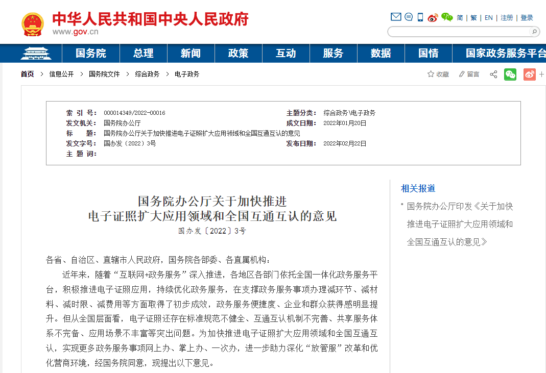 近日,国务院办公厅发布《关于加快推进电子证照扩大应用领域和全国互通互认的意见》(国办发〔2022〕3号),对电子证照的应用要求、基本原则、应用领域和目标等做出指示。文件提出,要充分依托全国一体化政务服务平台,推动电子证照在更多领域应用并实现全国互通互认,更好发挥电子证照应用在深化“放管服”改革、推进数字政府建设、建设人民满意的服务型政府中的支撑保障作用,不断提升企业和群众的获得感和满意度。电子证照作为纸质证照的辅助和补充,是实现群众”全程网办“、”掌上办“、”一次办“的重要工具,近年来在政府文件中被屡屡提及,足见其潜在的巨大价值。北京数字认证股份有限公司(简称”数字认证“)作为数字政府建设的重要参与者,始终走在行业发展前沿,研发电子签名、电子印章、电子证照、电子合同等可信基础设施,为教育部、交通部、卫生部、住建部、文旅部、公安部、外交部、国家知识产权局、中国残联、海关总署等多个部委和全国多省市客户提供密码服务,护航政务数字化安全、稳健发展。以密码技术为创新引擎,数字认证研发统一电子证照系统,面向自然人、法人及各委办机构,提供电子证照生成、检索、下载、获取和验证等综合服务。在电子签名、电子签章等核心密码技术支撑下,保障电子证照与实人真实对应、“人证合一”。同时,可实现与国家政务服务平台对接,以国家政务服务平台电子证照共享服务系统为总枢纽,实现电子证照跨地区、跨部门互认。基于“一次生成、多方复用、互认共享”等众多优势,数字认证电子证照已在新生儿出生医学证明、不动产登记证明、学历学位认证、残疾人身份验证等多个领域得到有效应用,大大改善了群众办事的便利性,提高了人民群众的获得感、幸福感、安全感。不仅如此,为加快电子证照与电子签名、电子印章等应用的融合,切实做到惠民惠企,数字认证早在2021年年初,就助力北京市新开办企业实现电子营业执照和电子印章同步发放(《数字认证助力北京实现电子营业执照和电子印章同步发放》)。截至目前,北京市已有255980家新开办企业法人单位申领了电子印章,发放数量超127万枚。此次意见的发布,将加快电子证照、电子签名、电子印章等在社会范围内的广泛应用,进一步提升政府服务能力。数字认证也将一如既往地紧跟政务数字化发展潮流,深挖密码技术与更多政务场景的融合,助力数字经济快速发展。