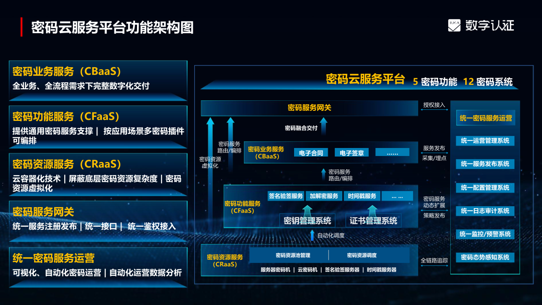 数字认证密码云服务平台基于“云计算与密码融合”的思维及“全融合、全场景、可信任 ”的密码云战略指导,采用密码资源服务(CRaaS)、密码功能服务(CFaaS)及密码业务服务(CBaaS)三层云架构体系,整合多年密码技术和互联网运营经验,构建出的一套面向客户全场景密码服务需求的全栈式密码服务。