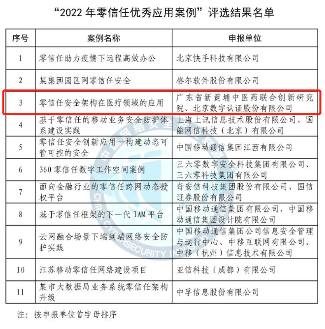 近日,由中央网信办网络安全协调局指导,中国网络安全产业联盟组织的零信任优秀应用案例评选结果发布,广东省新黄埔中医药联合创新研究院(以下简称“黄埔联创院”)和北京数字认证股份有限公司(以下简称“数字认证”)联合报送的《零信任安全架构在医疗领域的应用》凭借突出的实用性、创新性和先进性,从100多个参选方案中脱颖而出,入选CCIA“2022年零信任优秀应用案例”。