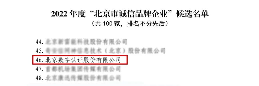 近日,首都精神文明建设委员会办公室公布了2022年度“北京市共铸诚信企业”“北京市诚信品牌企业”名单,北京数字认证股份有限公司(简称:数字认证)实力入围。