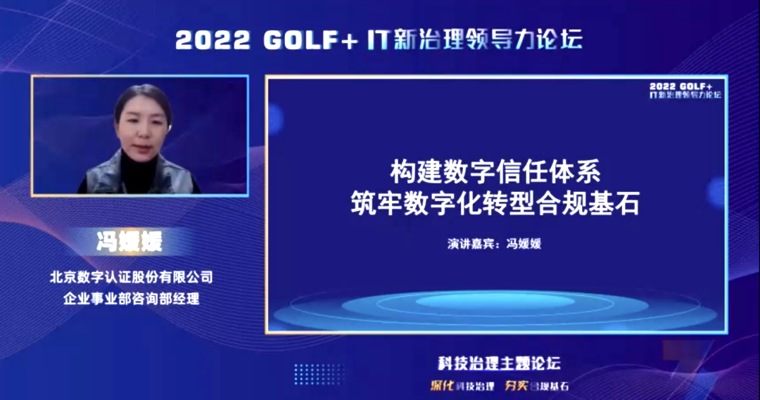 1月6~7日,由中国信息通信研究院、中国通信标准化协会主办,中国内部审计协会、中国互联网协会信息技术(IT)风险治理工作委员会支持的“2022 GOLF+ IT新治理领导力论坛”,以线下结合线上的方式成功举行。数字认证公司企业事业部咨询部经理冯媛媛受邀出席“科技治理”主题论坛,围绕数字信任在企业数字化转型中的应用与合规管理的实践成效进行了重点分享。