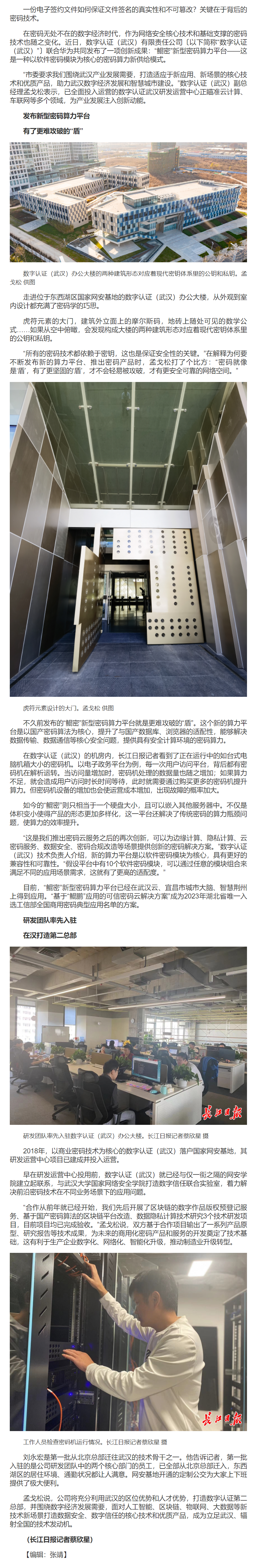 【转载长江日报】“鲲密”密码技术筑起更坚固的“盾”,数字认证在汉打造第二总部
