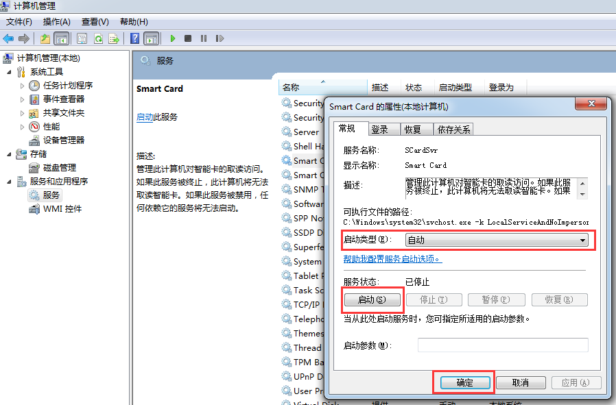 点击【启动类型】将类型选为"自动"——在"服务状态处"点击【启动】——单击【确定】按钮,完成"Smart Card"服务启动,如下图: