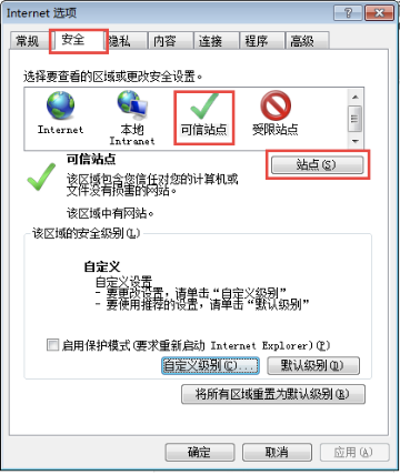 4)依次点击"安全"——"可信站点"——"站点",如下图: